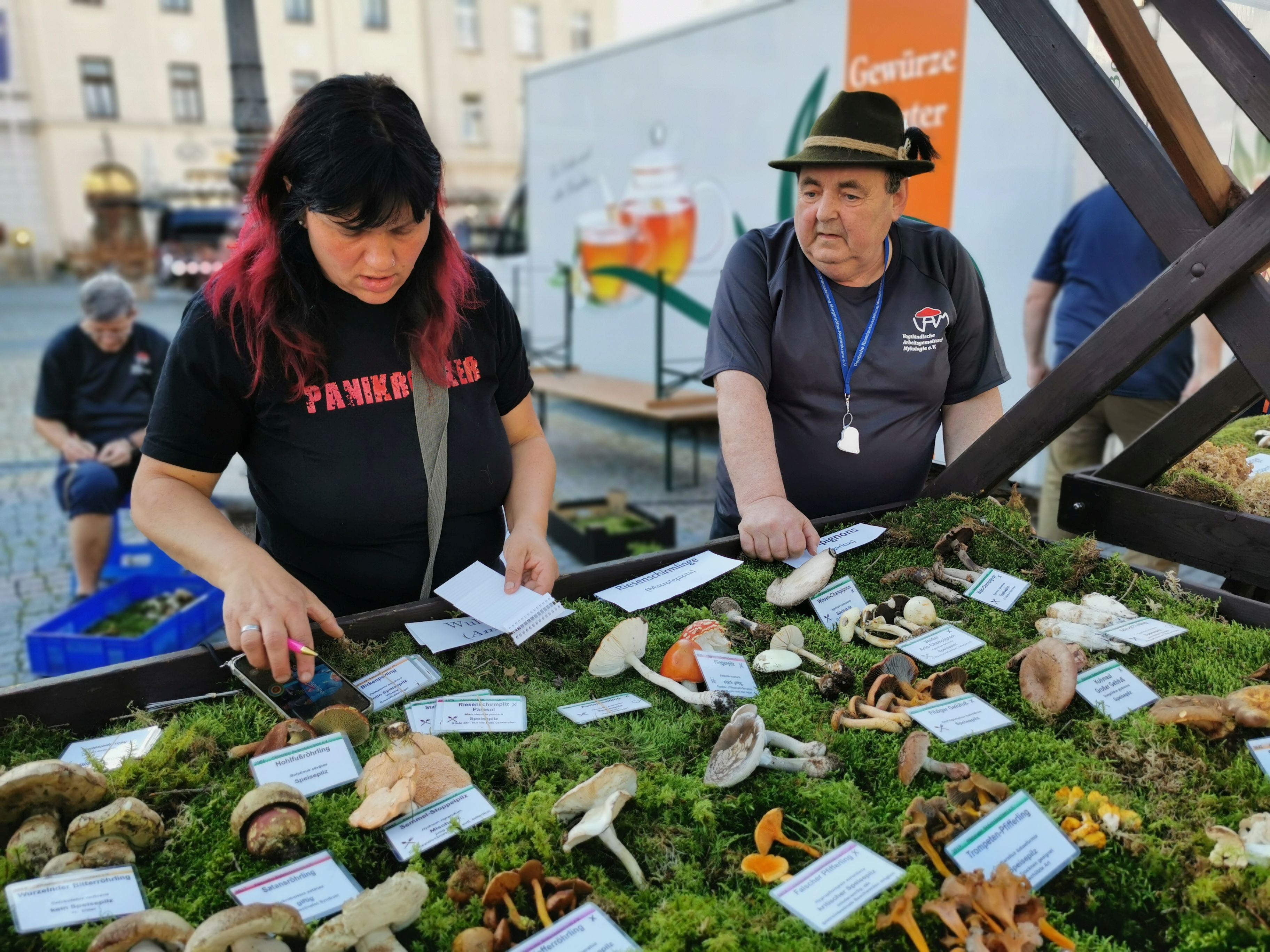 Das herrliche Wetter führte zu einem hohen Besucheraufkommen. Viele der ausgestellten Pilze litten unter den hohen Temperaturen. Auch für die Betreuer war der Tag aufgrund der Hitze anstrengend. Dennoch scheuten sie keine Mühe, alle Fragen der zahlreichen Marktbesucher ausführlich zu beantworten.